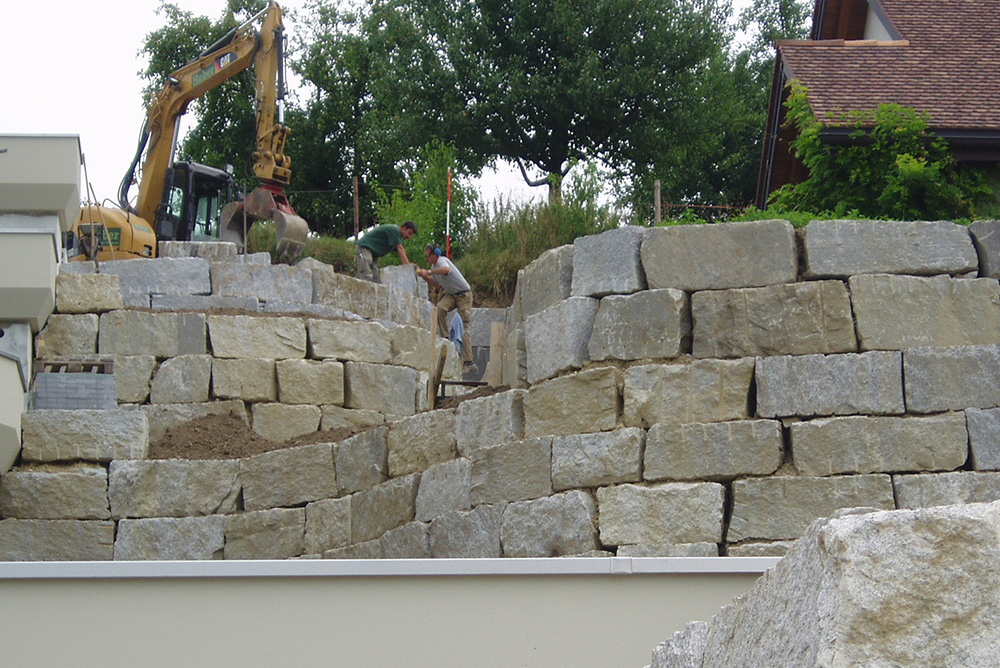 Mit Blocksteinmauern lassen sich grosse Terrainunterschiede überwinden. Sie werden versetzt angeordnet und je nach Situation auch hinterbetoniert. Das damit erzielte Plus an nutzbarer Gartenfläche gibt vielen Gartensituationen ganz neue Perspektiven.