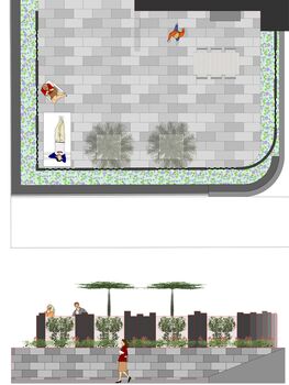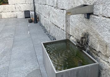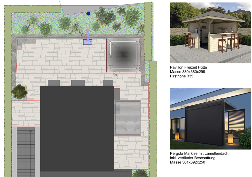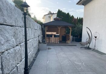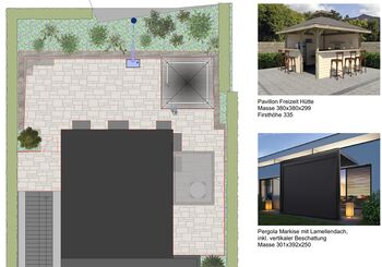 Gartenumgestaltung mit Stützmauer und Pavillon