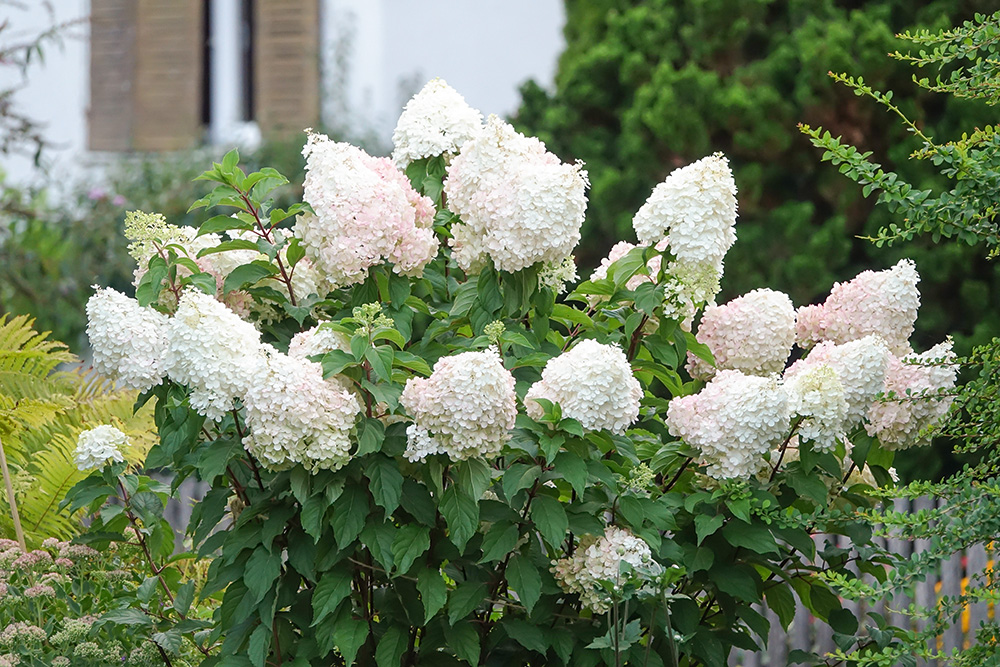 Während die klassischen Bauernhortensien in fast jedem Bauerngarten anzutreffen sind, wirken die Rispenhortensien etwas eleganter, weshalb sie bei Neubauten oft den Zuschlag erhalten. Auch punkto Blühsicherheit ein guter Entscheid: im zeitigen Frühjahr wird einfach fast bodeneben auf kurze Zapfen zurückgeschnitten – einfacher geht's kaum. Zudem: manche Sorten bilden enorm grosse, bis 40 cm (!) lange Zuckerhüte von Blüten.