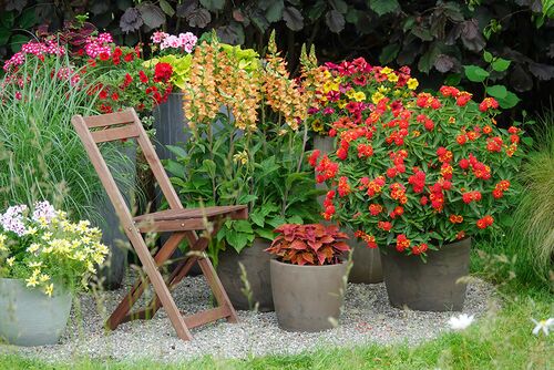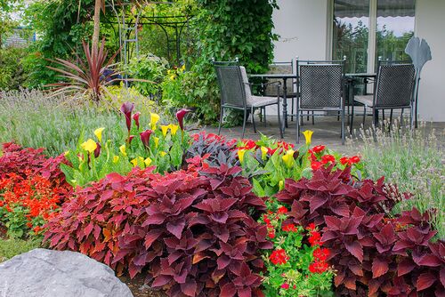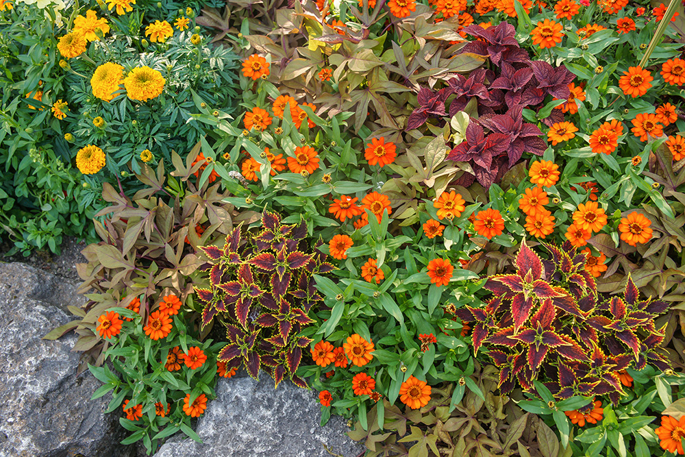 Mit Wechselflor für Beete und Rabatten lassen sich tolle Farbmuster erzeugen. Für flächige Bepflanzungen sollte dabei auf Farbharmonie und Wiederholung gesetzt werden. Zu bunt und vielfältig kann also auch zu viel des Guten sein… Im Bild eine attraktive Mischung mit Zinnien, Buntnesseln, Zierkarfoffeln und Tagetes.