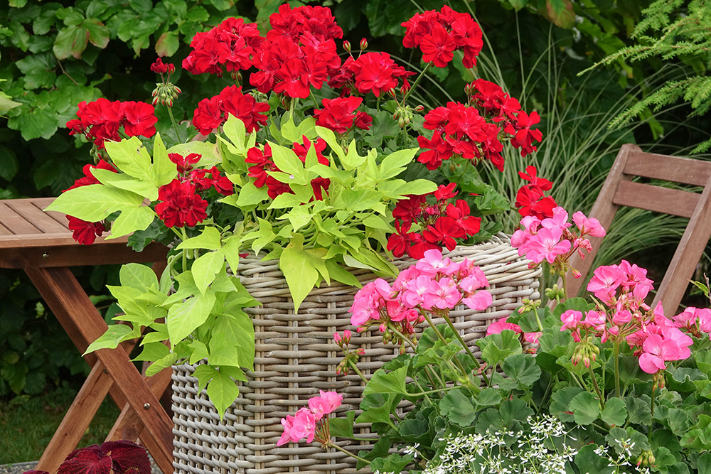 Traditionelle Beet- und Balkonpflanzen wie Geranien wirken in guter Gesellschaft keineswegs altmodisch sondern frech und modern. Eine tolle Partnerschaft gelingt z.B. mit Zierkartoffeln (Ipomea). Es gibt sie in verschiedenen Farbnuancen von Limettengrün bis Dunkelaubergine, ganzrandig oder (verschieden stark) geschlitztblättrig.