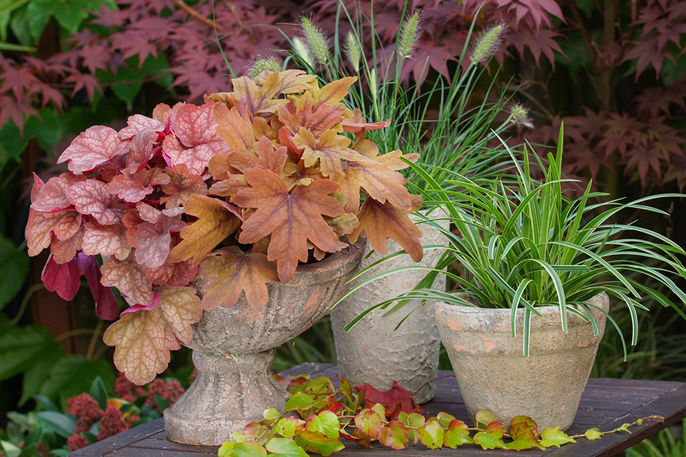 Der Herbst ist eine sehr spannende Jahreszeit. Während im Frühherbst bekannte Klassiker wie Chrysanthemen, Zyklamen, Physalis & Co. bunte Kombinationen erlauben, die dem Sommer kaum nachstehen, lässt sich mit Blattschmuck, Gräsern, Beerentragenden, Heidepflanzen und anderen robusten Stauden wundervoll Ton-in-Ton arbeiten.