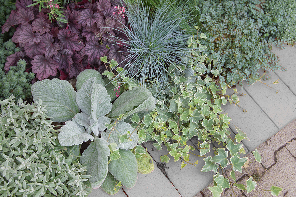 Wer sagt denn, dass im Winter rund ums Haus keine attraktive Saisonbepflanzung möglich ist? Gerade verschiedene Silberlaubige Pflanzen wie Silberrauten, Blauschwingel, Silberzapfen, Stacheldraht, Heiligenkraut, Silberblatt-Salbei, Greiskraut, Wollziest und andere harmonieren traumhaft mit wintergrünen Heucheras, Efeu und Konsorten.