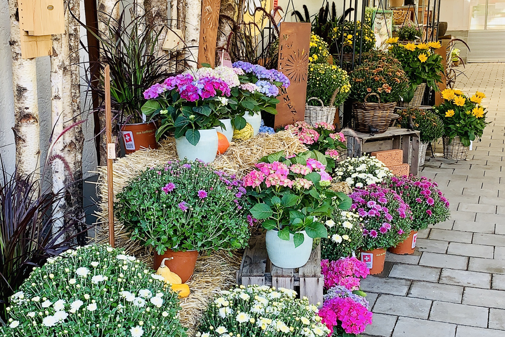 Im Spätsommer kommen die ersten farbenprächtigen Chrysanthemen, Cyklamen, Enziane und Konsorten in den Verkauf. Auch die Auswahl an dekorativen Blattschmuckpflanzen wie Purpurglöckchen und Gräser nimmt laufend zu. Im September-Oktober steht dann das ganze Herbstzauber-Sortiment für Sie bereit, das mit seinen bedeckten, erdverbundenen Farben ebenso attraktiv wirkt.
